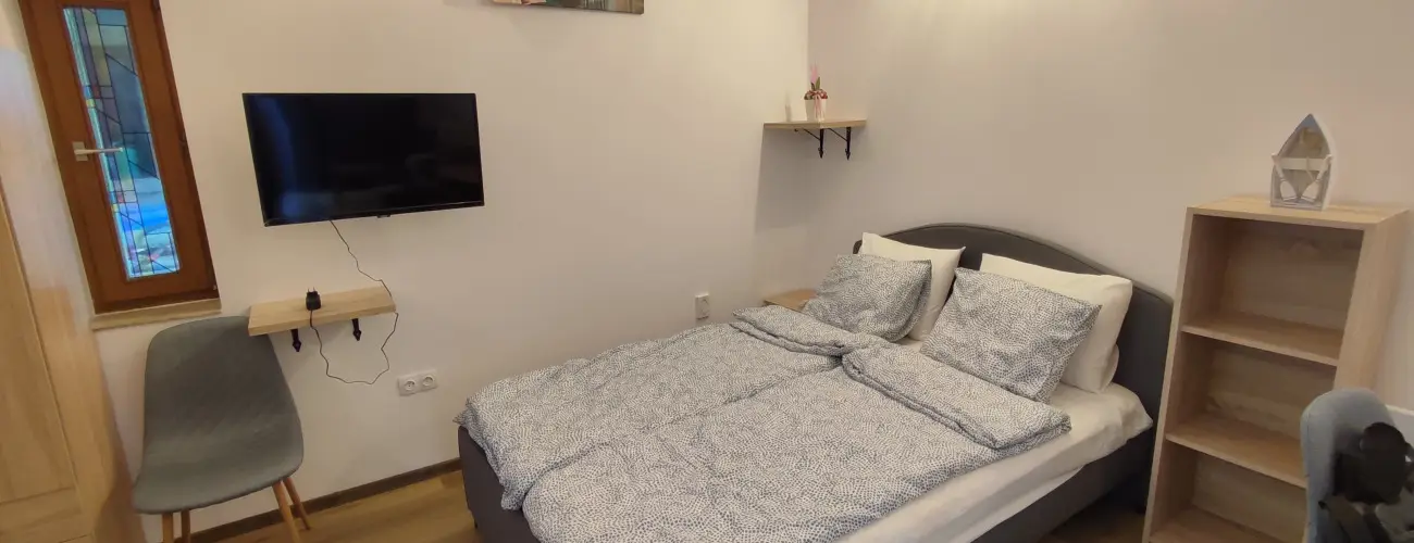 Az apartman Velence csendes kertvárosi övezetében saját kerttel (kerti bútorokkal) és parkolási lehetőséggel (apartman előtt) rendelkezik. A szállás 2 fő felnőtt fogadására a legkényelmesebb, további 2 fő (14 éves korig) gyermek részére kihúzható kanapéágyat tudnak biztosítani. Az egylégterű apartmanban nappali, étkező, jól felszerelt teakonyha, hálórész, valamint külön zuhanyzós fürdőszoba található. Konyhában főzőlap, hűtő, mikrohullámú sütő, szendvicssütő, vízforraló és kávéfőző található. A rövid időre érkező vendégeknek pár napra való cukor, alapfűszerek, tea és kávé bekészítést biztosítanak. Egyéb Felszereltség: Síkképernyős TV magyar és nemzetközi tévécsatornákkal, egyedileg szabályozható hűtő/fűtő légkondicionáló, elektromos fűtő panel, törölköző.