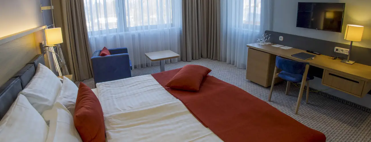 92 korszerűen kialakított standard és superior szoba (28 és 38 négyzetméter) és 2 lakosztály (115 négyzetméter), illetve az elsőrangú szolgáltatások készen állnak arra, hogy az itt tartózkodást felejthetetlen élménnyé tegyék a vendégek számára. Mindegyik szoba légkondicionált, fürdőszobával és toalettel, széffel, telefonnal, hajszárítóval, LED televízióval és Wi-Fi internettel felszerelt.